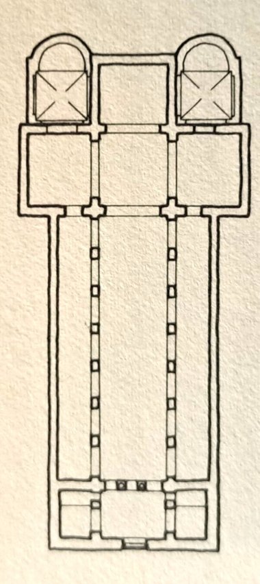 Wormser Bauleute errichteten eine große, flachgedeckte dreischiffige Basilika mit Querhäusern und einem gerade abgeschlossenen Chor.