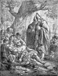 Die Radierung (Bernhard Rode 1781) zeigt den schwer verwundeten Rudolf von Rheinfelden, der in der Schlacht von Hohenmölsen 1080 von Heinrich IV. besiegt wurde. Ihm wurde die Hand abgeschlagen, mit der er einst Heinrich IV. die Treue geschworen hatte.