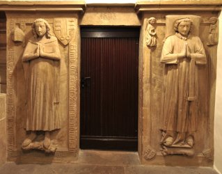 Am Eingang zur Krypta im Dom St. Peter sind die Grabplatten zweier Brüder aufgestellt, die beide 1348 im Jahr der großen Pest gestorben sind.
