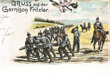 Auf einer Ansichtskarte von 1898 sind Fritzlarer Artilleristen bei einer Gefechtsübung abgebildet.