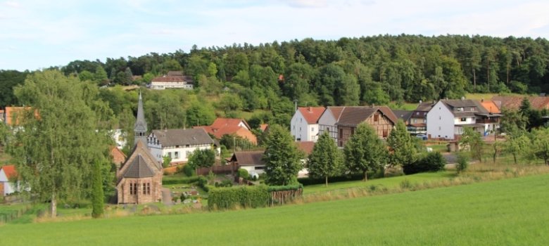 1209 als Rothelmeshusen erwähnt, liegt von Laub- und Nadelwäldern umgeben, 4,5 km südwestlich von Fritzlar.
