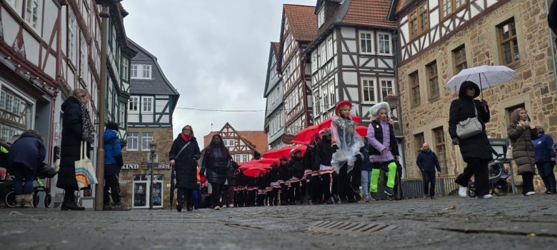 Mit roten Schirmen und wetterfester Kleidung trotzten die jungen Aktiven dem Nieselregen. Die Garden präsentierten sich in ihren traditionellen Farben und sorgten auch bei grauem Himmel für Farbtupfer in der Innenstadt.