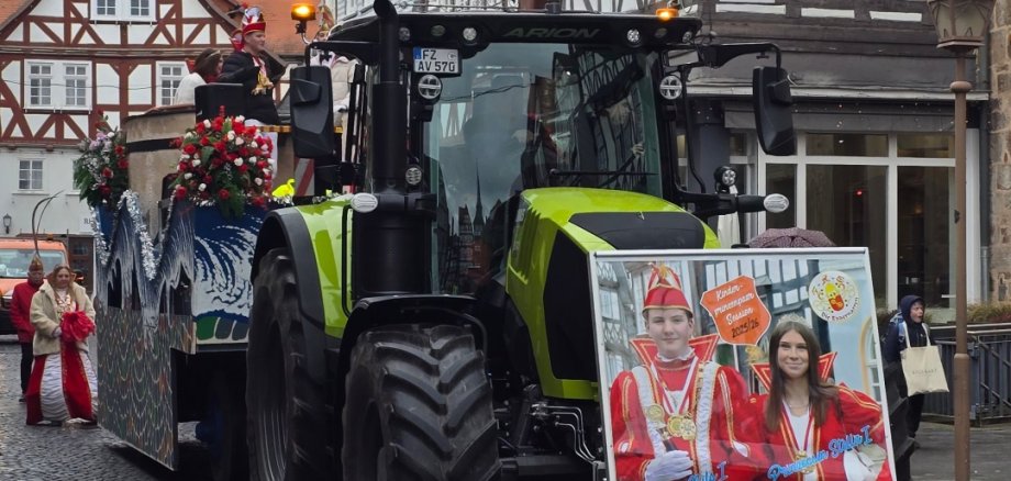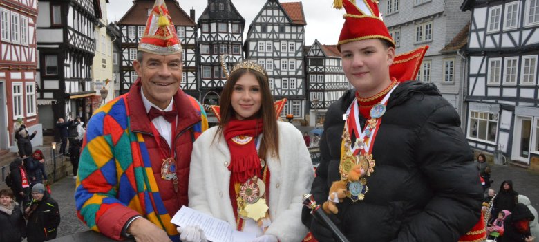 Auf dem Marktplatz hatten sich bereits einige Zuschauerinnen und Zuschauer eingefunden, um den Umzug zu empfangen. Dort begrüßte Bürgermeister Spogat den närrischen Kinderprinzumzugswagen offiziell. Er dankte Prinz Nils I. und Prinzessin Stelle I. für ihr Engagement während der Session, lobte ihren Einsatz für den Fritzlarer Nachwuchskarneval und überreichte ihnen als Anerkennung eine kleine Aufmerksamkeit.