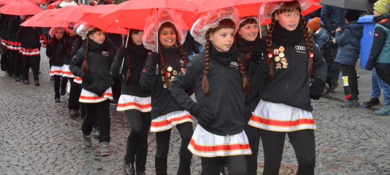 Bei regnerischem Schmuddelwetter setzte sich der schwarz-rot-weiße Kinderumzug am Faschingsdienstag vom Grauen Turm in Richtung Marktplatz, mit viel Musik, in Bewegung. Angeführt wurde der närrische Lindwurm von den Gardetänzerinnen der Eddernarren, gefolgt von Prinz Nils I. und Prinzessin Stella I. auf Ihrem Umzugswagen und weiteren Gardetänzerinnen sowie dem Stadtprinzenpaar durch die Altstadt zogen.