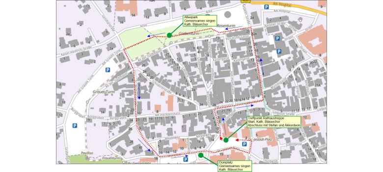 Angeführt von „Sankt Martin“, wollen wir am Abend durch die Fritzlarer Innenstadt ziehen und mit den bunten Laternen, den Fackelträgern der Jugendfeuerwehr, der Feuerwehr sowie des THW Fritzlars die Straßen und Gassen in stimmungsvolles Licht tauchen. Treffpunkt ist um 18.00 Uhr auf dem Dr.-Jestädt-Platz. Musikalisch begleitet werden wir vom katholischen Bläserchor sowie Stefan mit dem Akkordeon. Der Streckenverlauf ist nachfolgend abgebildet. Nach dem Abschlusslied gibt es die beliebten Sankt-Martins-Brezeln vom Cafe Hetzler für die Kinder.