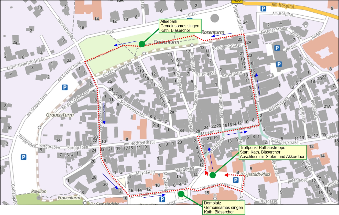 Angeführt von „Sankt Martin“, wollen wir am Abend durch die Fritzlarer Innenstadt ziehen und mit den bunten Laternen, den Fackelträgern der Jugendfeuerwehr, der Feuerwehr sowie des THW Fritzlars die Straßen und Gassen in stimmungsvolles Licht tauchen. Treffpunkt ist um 18.00 Uhr auf dem Dr.-Jestädt-Platz. Musikalisch begleitet werden wir vom katholischen Bläserchor sowie Stefan mit dem Akkordeon. Der Streckenverlauf ist nachfolgend abgebildet. Nach dem Abschlusslied gibt es die beliebten Sankt-Martins-Brezeln vom Cafe Hetzler für die Kinder.