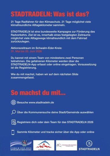 zu nutzen.“ Der Auftakt findet am Sonntag, 31. Mai 2026, um 14 Uhr auf dem Marktplatz in Homberg (Efze) statt und wird von einem Fahrradsegen begleitet. Die Anmeldung für Teams und Teilnehmende ist ab sofort möglich. Mitmachen kann jeder: Einfach auf STADTRADELN registrieren, die eigene Kommune aus-wählen, ein Team gründen oder einem bestehenden Team beitreten und losradeln. Die gefahrenen Kilometer werden über die App oder online erfasst. Ob alleine, im Team, mit Familie oder Kolleginnen und Kollegen – jeder Kilometer zählt und trägt dazu bei, den Klimaschutz zu stärken und die Städte und Gemeinden im Schwalm-Eder-Kreis lebenswerter zu machen. Auch Nahmobilitätskoordinator Stefan Cichosz sieht in der Aktion großes Potenzial: „STADTRADELN ist eine einfache Möglichkeit, das eigene Mobilitätsverhalten zu hinterfragen. Viele merken schon nach wenigen Tagen, wie gut sich Wege im Alltag mit dem Fahrrad zurücklegen lassen.“